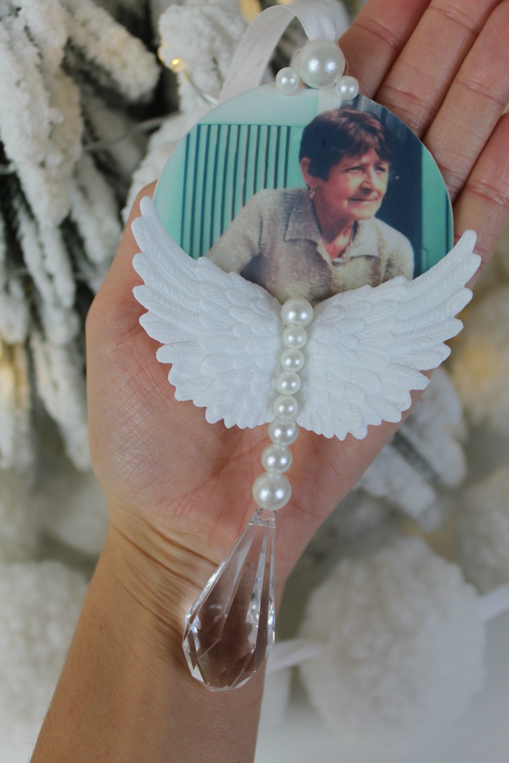 Material: Acrylic base with hanging crystal/pearls.
